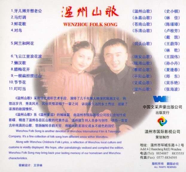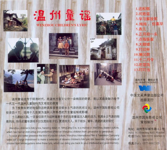 Here is a VCD with Folk Lyrics and children songs from different areas within Wenzhou, together with videos in beautiful surroundings.